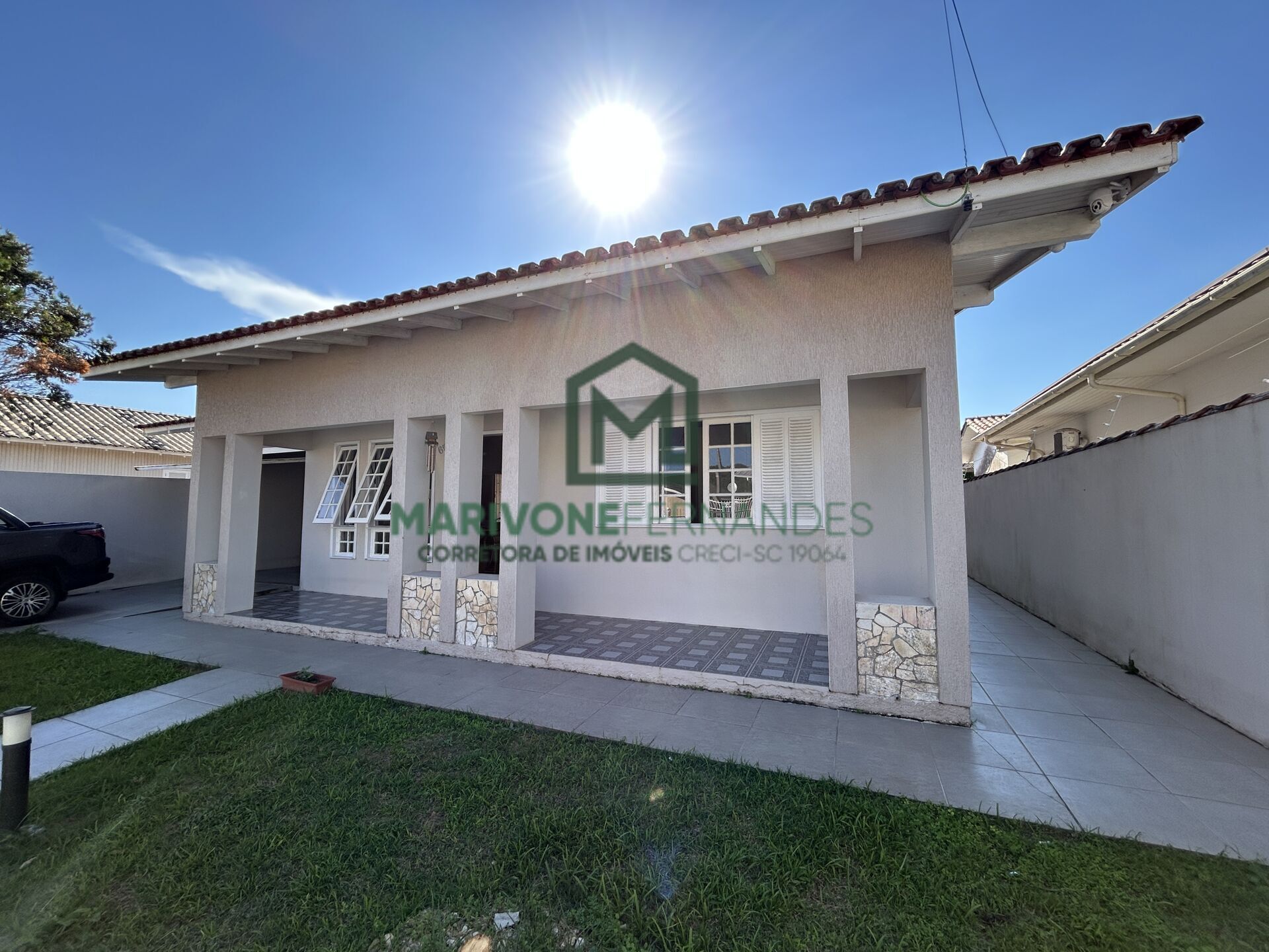 Casa a venda no bairro Portinho com quatro dormitórios, sendo uma suíte. Vagas para quatro carros, edícula com churrasqueira, ambientes amplos com jardim na frente e espaços de circulação. O imóvel possui 12 placas solares com autonomia de 704 KWA.